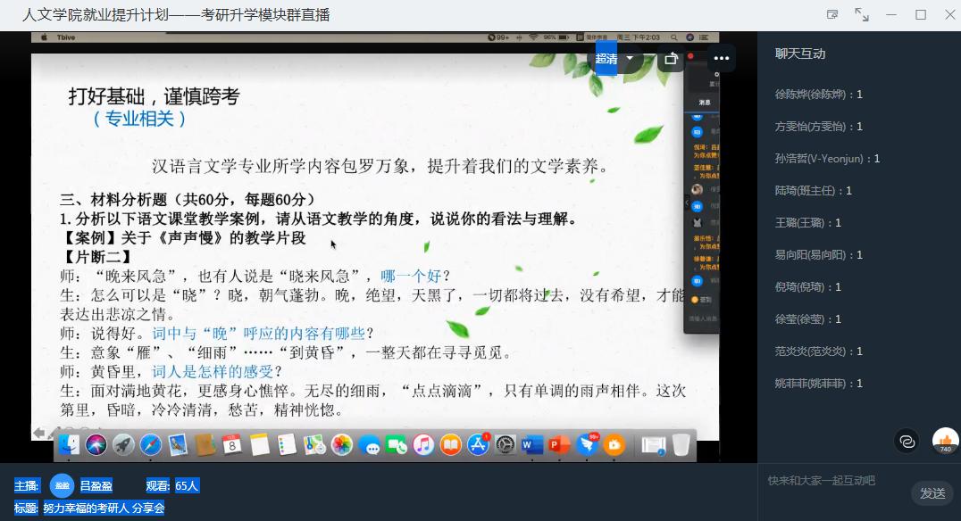 为进一步让av视频 学生明确考研目标,掌握相关考研技巧,了解更多相关信息,12月8日,考研经验分享会在线上钉钉举行,杭州师范大学钱江学院汉语言专业学生吕盈盈(现已顺利考取温州大学研究生)受邀担任主讲并分享了她的考研经验。