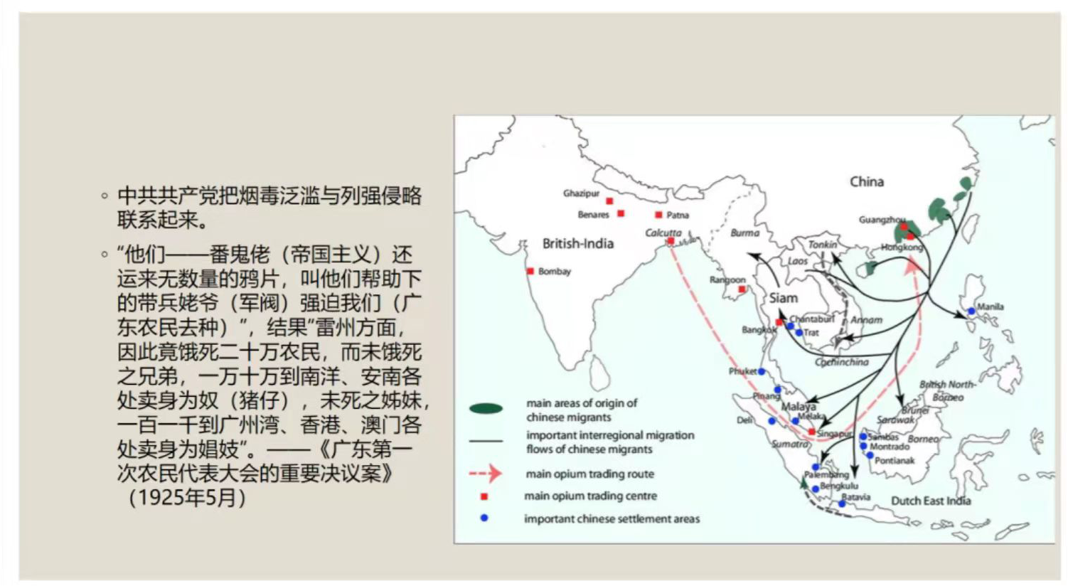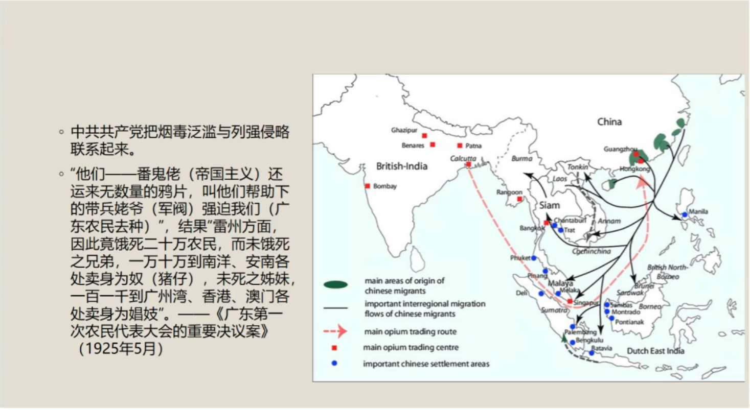 孙超首先从鸦片、吗啡、海洛因、大麻等几种常见毒品类型入手,介绍了毒品危害中国社会的基本情况,接着借用文献、图片、数据等材料展示了鸦片在中国的传播历程。他指出,中国共产党成立后,将近代烟毒泛滥与列强的对华侵略联系了起来。