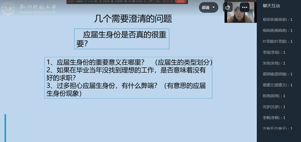 针对毕业生可能出现的各种不良心态以及存在的几个观念误区,陈晓玲通过几个往届毕业生的真实案例鼓励同学们保持自信、勇于尝试,切勿盲目二战。针对同学们找工作遇到的困难,陈晓玲给予了详细的建议:从收集信息、海投简历等方面做好基本工作,利用好学院就业发展指南,多虚心向过来人请教,积极参加各项招聘笔试面试以提升自我能力。针对不同类型同学,陈晓玲也给予了相应的建议:已落实工作的同学应关注自身是否满足进编条件,及时查漏补缺;考研同学应多手准备,在等待成绩的空档期投身就业招聘;未落实工作的同学应反思自我,不断提升自我能力。