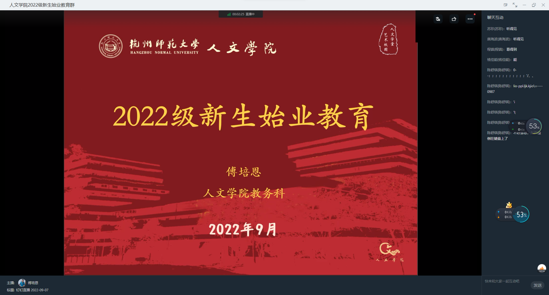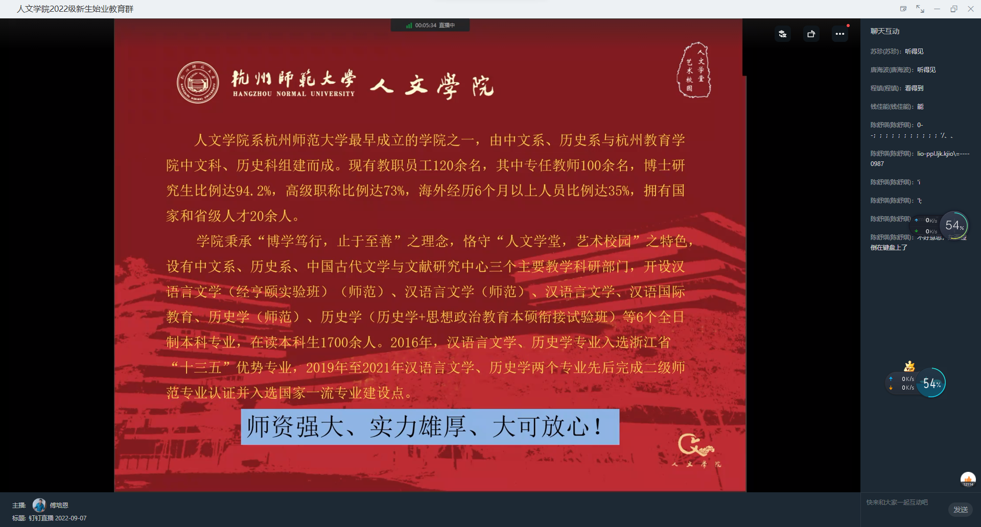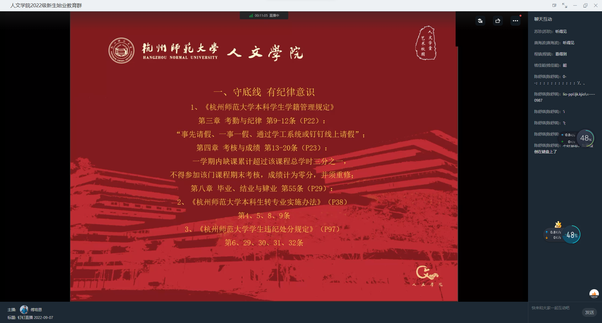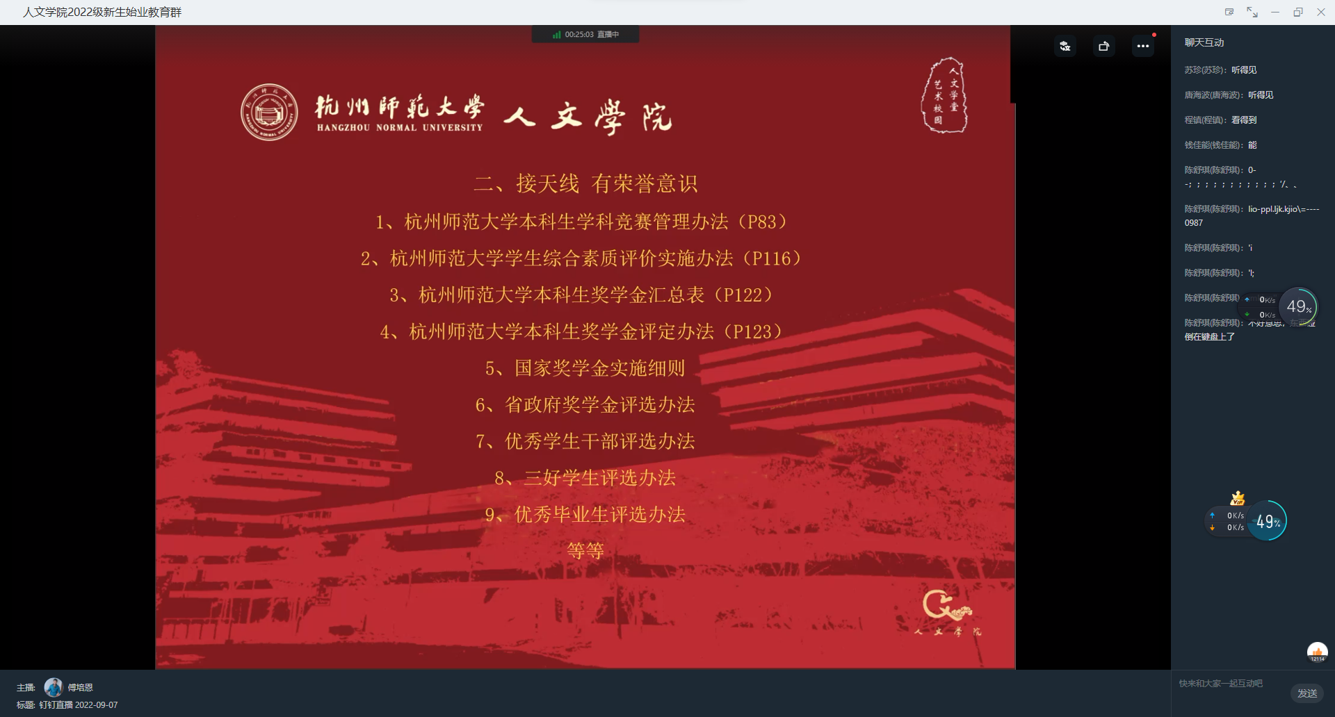 9月7日下午,av视频 “初心学堂——2022新生专业启蒙教育大会”以线上讲座的形式开展,本次会议由教务科科长傅培恩老师主讲,全体2022级本科新生参加了会议。会议旨在帮助2022级新生了解专业课程,更好地适应大学学习节奏。