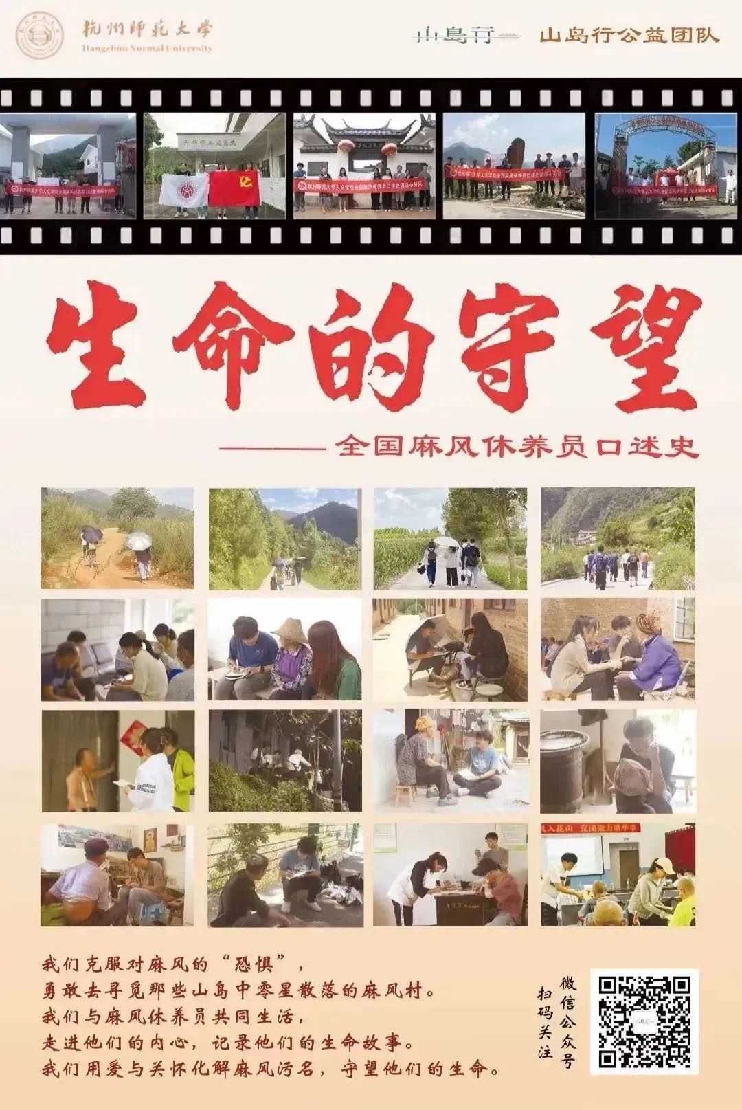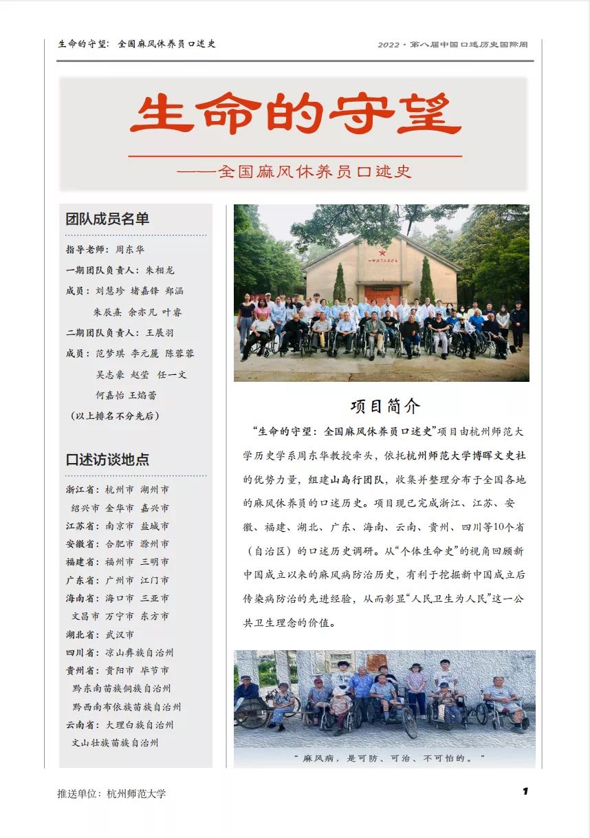 “全国麻风休养员口述史”项目由杭州师范大学历史学系主任周东华教授牵头,依托山岛行团队,收集整理并研究分布于全国各地的麻风休养员、麻风病医生、麻风防治义工等群体的口述历史。项目现已完成全国范围内10个省(自治区)的口述历史调研。从“个体生命史”的视角回顾新中国成立以来的麻风病防治历史,展现举国体制下麻风病防治取得的重大成效,有利于挖掘新中国成立后传染病防治的先进经验,从而彰显“人民卫生为人民”这一公共卫生理念的价值。