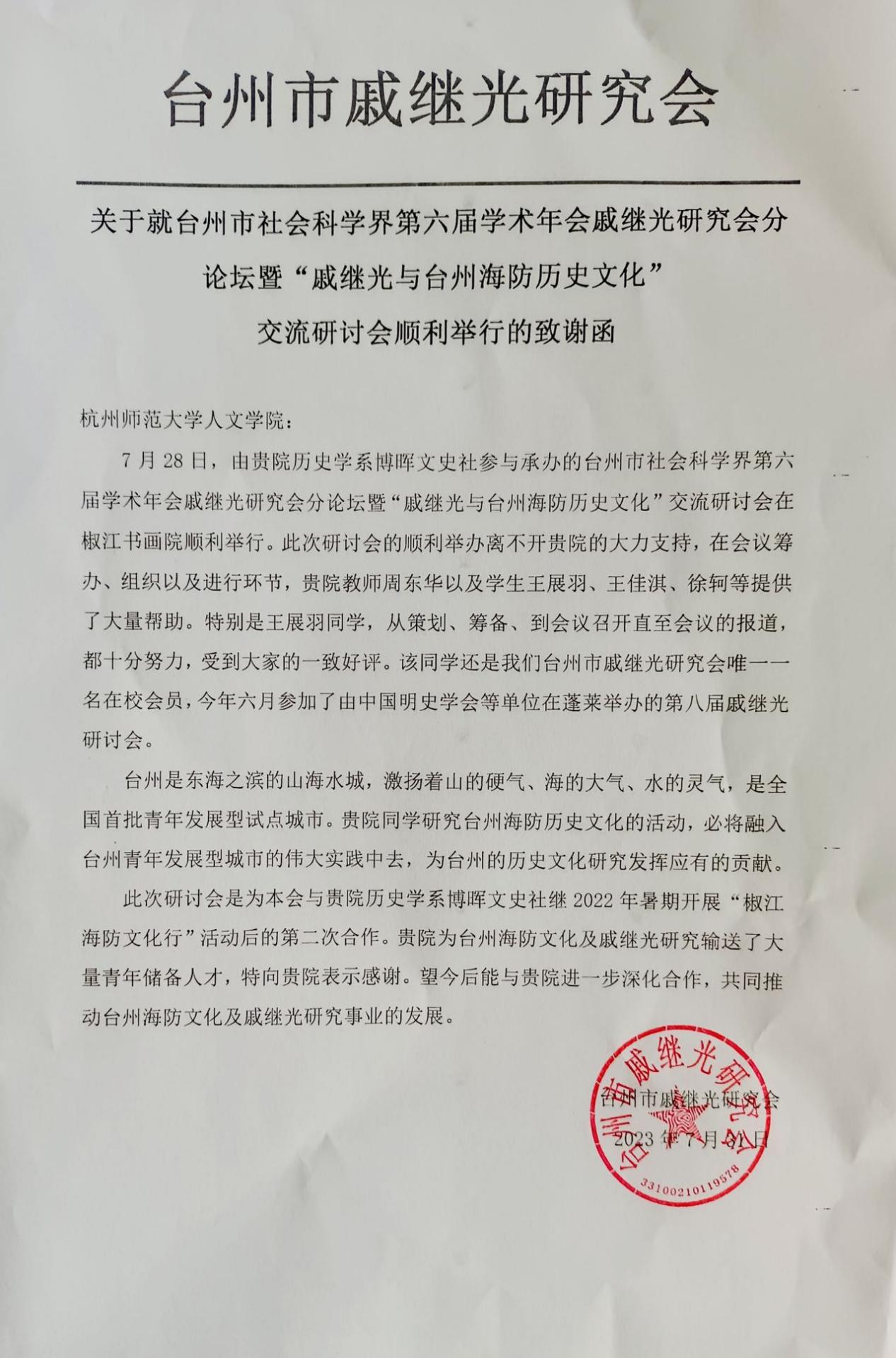 会后,台州市戚继光研究会还向av视频 发来致谢函,感谢av视频 师生在此次会议中所做出的贡献,并表示希望同av视频 师生进一步深化合作,共同推动台州海防文化及戚继光研究事业的发展。