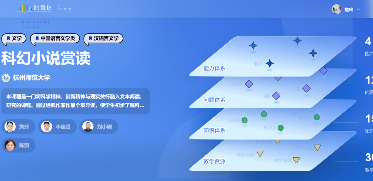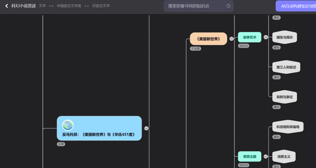 《科幻小说赏读》是杭州师范大学汉语言文学国家一流本科专业(建设点)的专业选修课程,也是浙江省课程思政示范课程。作为汉语言文学专业学生的专业选修课之一,课程将科学精神、创新精神与现实关怀融入文本阅读、研究,所覆盖的知识点具有跨学科交叉性,对于文科学生而言有一定难度。为帮助学生深入理解课程的知识点及其相互联系,课程团队利用知识图谱的思想和技术,构建了一张覆盖课程全领域、结构清晰的知识图谱。