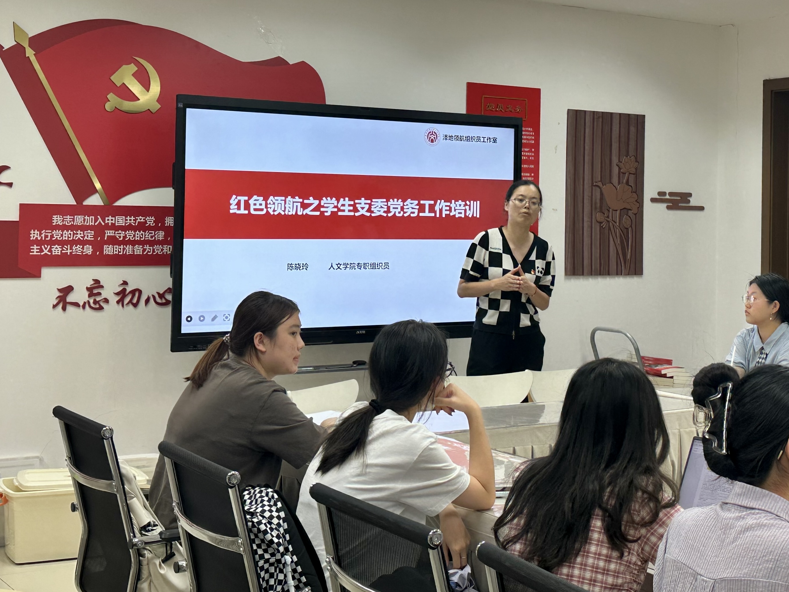 本次培训由陈晓玲老师主讲。她从“党务工作的严谨性”这一问题切入,系统阐述了党支部的基本定位与高校党组织的组织架构,具体介绍了高校党委和院系党组织的主要职能,并进一步围绕“学生党支部的主要功能”这一核心议题展开讲解。随后,她对支部书记、组织委员和宣传委员等支委成员的岗位职责进行了逐一说明。在明确职责的基础上,陈晓玲老师就如何有效发挥支委作用提出了具体建议,强调应推进“党支部日常工作的标准化与规范化”,并鼓励支委积极发挥组织和协调能力,充分调动正式党员、团支书和志愿者等多方力量,同时也要加强自身对党内相关制度规范的学习与理解。接着,陈晓玲老师细致讲解了“三会一课”、主题党日等支部常规工作的开展流程与注意事项,特别强调了支部记录本的规范填写要求。培训会的最后,陈晓玲老师针对大家提出的档案保管、转专业学生党员发展工作步骤、西湖系统维护等问题进行了现场答疑。
