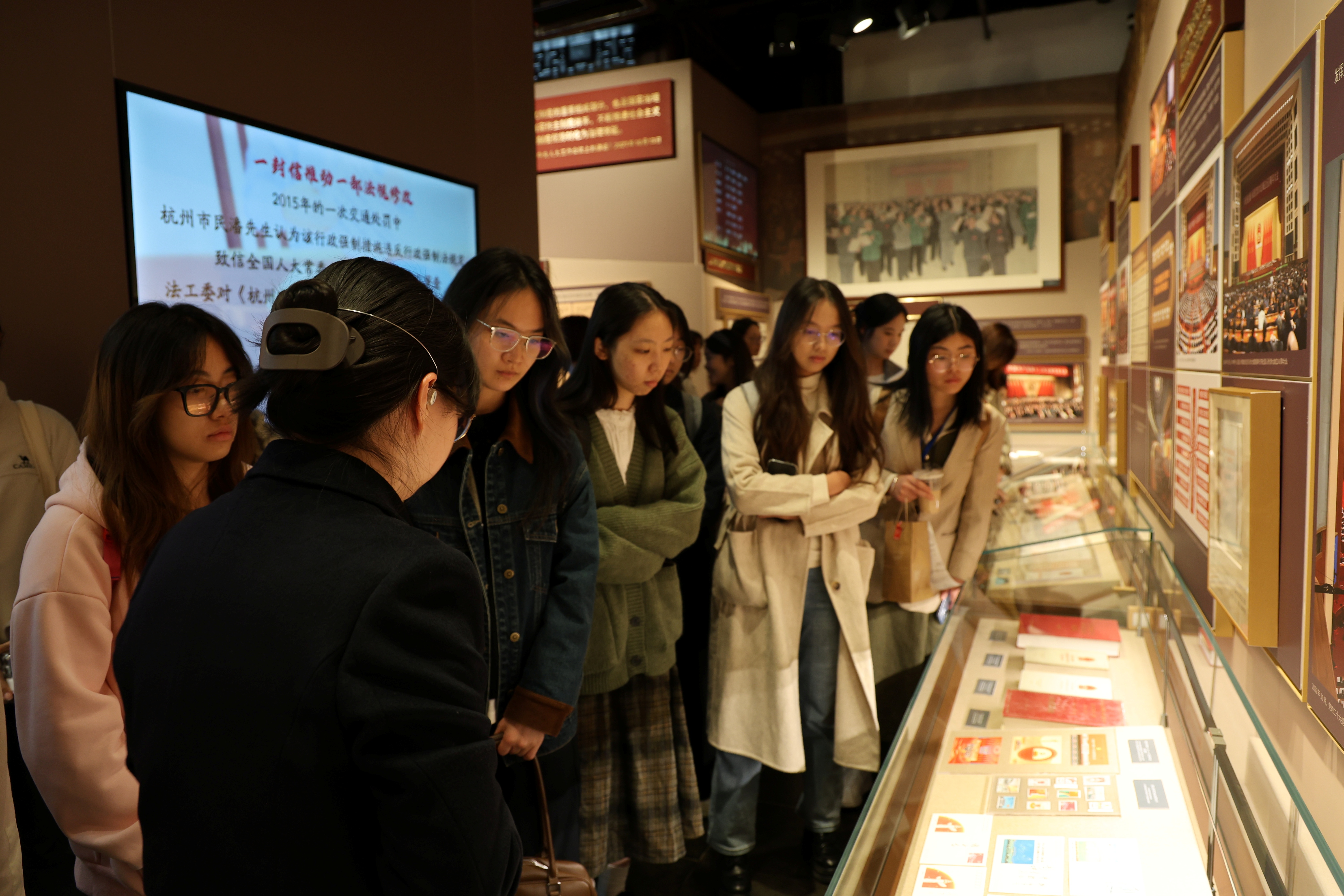 在杭州市政协新时代协商民主实践中心,同学们则走进了另一条民主路径——协商民主。这座面积达5300平方米的空间,集陈列展示、协商议政、学习交流、互动体验于一体,生动铺陈新时代协商民主在杭州的实践画卷。跟随着讲解员的脚步,同学们依次参观了“凝聚共识”“建言资政”“协商为民”等主题展区。一张张珍贵的历史照片、一段段鲜活的影像资料,串联起杭州政协70余年的发展脉络。从“协商建国”到“协商治城”,从“西湖疏浚”到“斑马线礼让”,政协提案见证了城市文明的每一次跃升。在“求是书房”,同学们静静翻阅《政协委员履职手记》《协商民主在杭州》等书籍,感受书香与民主的交融,体会思想与制度的共鸣。