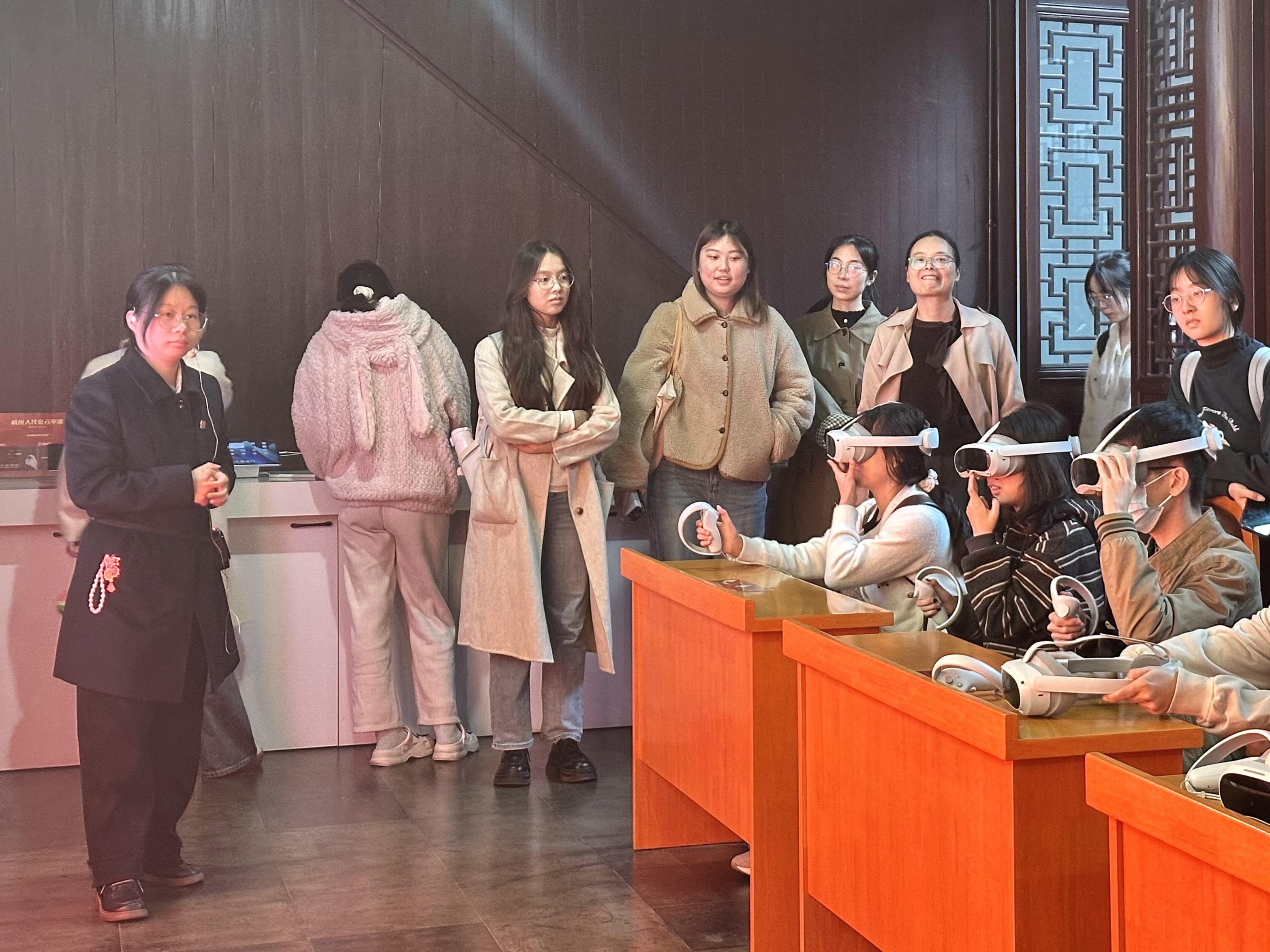 移步至“民意汇集”智能展示屏,屏幕上全市700多个人大代表联络站的实时数据不断跃动着。历史233班的张菡夏驻足良久,深有感触:“屏幕所列出的数不清的代表建议与办理回执令我动容,这里呈现的每一条建议都承载着群众期盼,而每一份回复都彰显着‘民有所呼、我有所应’的担当。”这里不仅是人大代表联系群众的“神经中枢”,更是民意汇聚、制度展示的“智慧大脑”。而在“我来当代表”人大元宇宙体验区,同学们戴上VR设备,化身“杭州市人大代表”,从步入会场、听取报告,到投票表决、宪法宣誓,完整模拟履职全流程。那一刻,宪法不再是书本中的条文,而是手中高举的承诺,是心中涌动的使命。