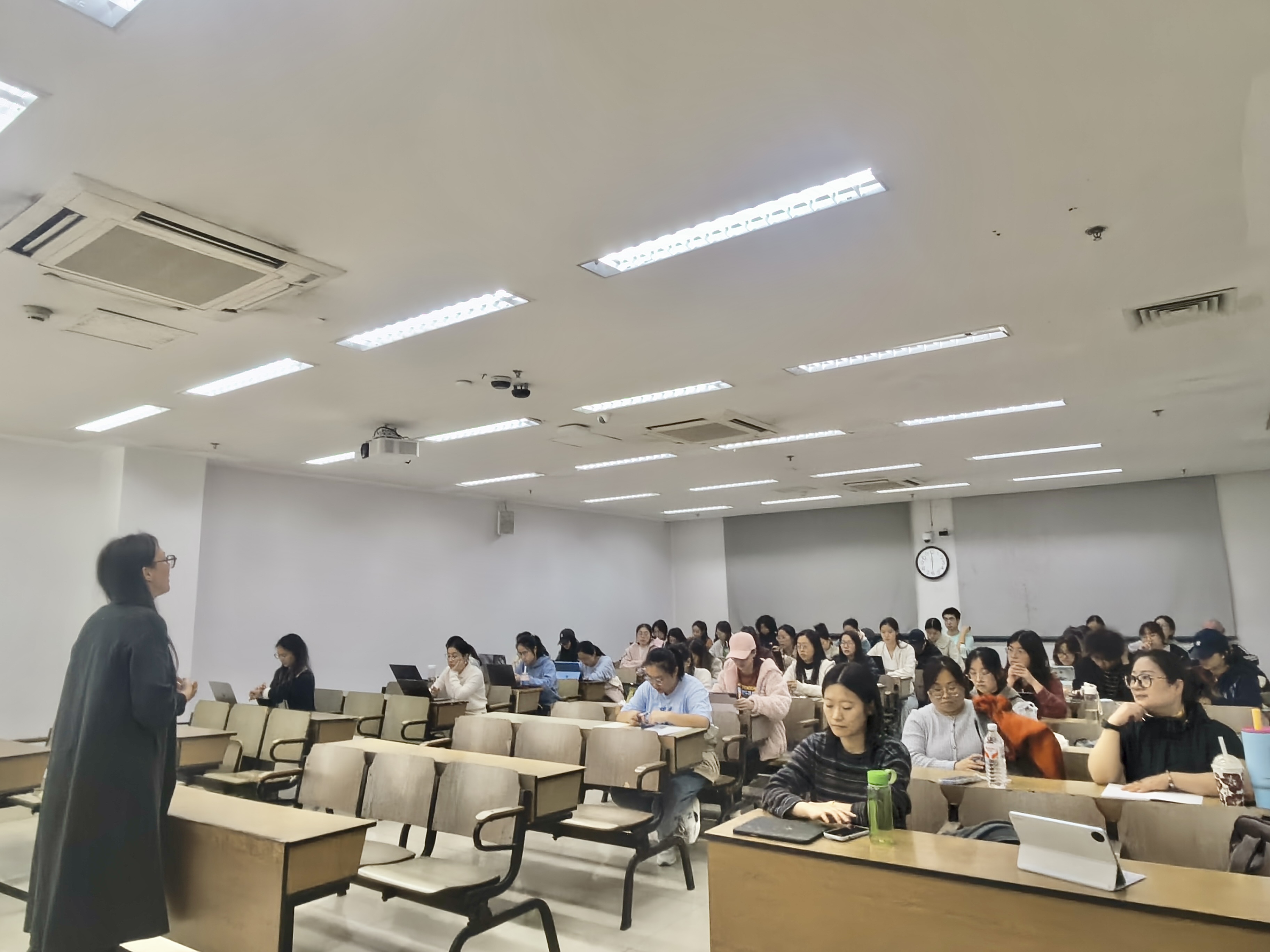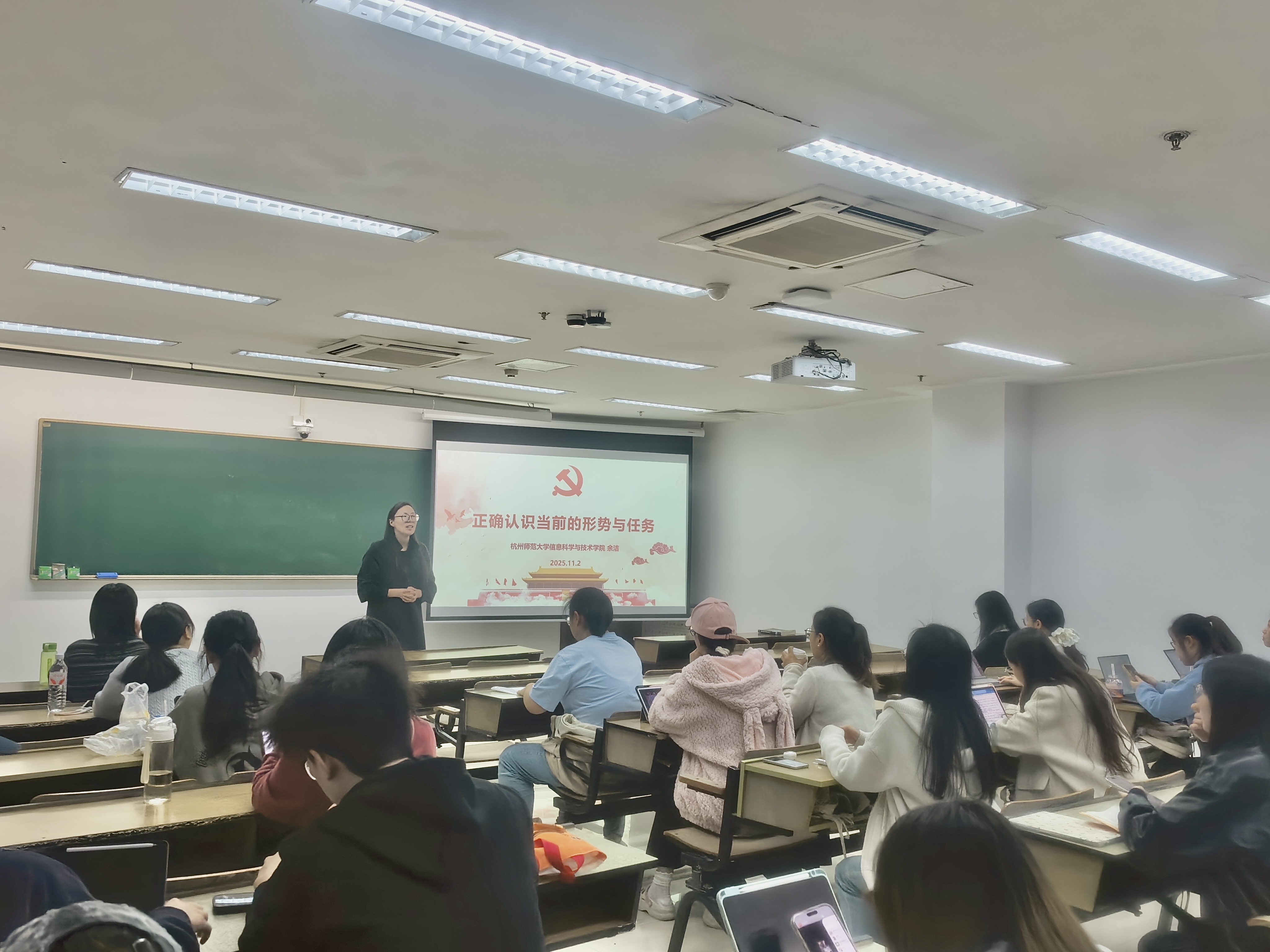 11月2日晚,余洁老师在恕园10-102教室面向全体发展对象,展开《正确认识当前的形势与任务》的党课培训。余老师将“当前新形势如何认识”、“现在新部署应怎么看”、“未来新任务该如何干”三个问题作为总体叙述脉络,用深入浅出的例子对当前的形势与任务进行了细致的讲解。着眼当前新形势,余老师聚焦我国经济、政治等领域分析了我国当前的发展状况,例如我国当前经济成就巨大,但仍存在科技创新能力不足等内部问题和严峻的对外局势,这些成就与问题激励着我们奋力开创我国高质量发展新局面。面对现在新部署,余老师通过对党的历届四中全会的回溯,分析其历史主线的逻辑,引导学员们全面理解党的二十届四中全会的目标原则。放眼未来新任务,余老师鼓励发展对象们要挺膺担当,肩负起新时代青年大学生的使命与责任,同时分析了全面创新的重要意义与发展新质生产力的必然要求,强调科技自立自强的必要性,提倡学员们跨学院组队,共同学习进步。面对人工智能时代的到来,余老师建议人文学科积极地拥抱AI技术,同时也强调人机协同中人类创造力的核心地位。最后,余老师寄语各位发展对象要“又红又专”,品德为先,能力为重,成为全面发展的后备干部人才。