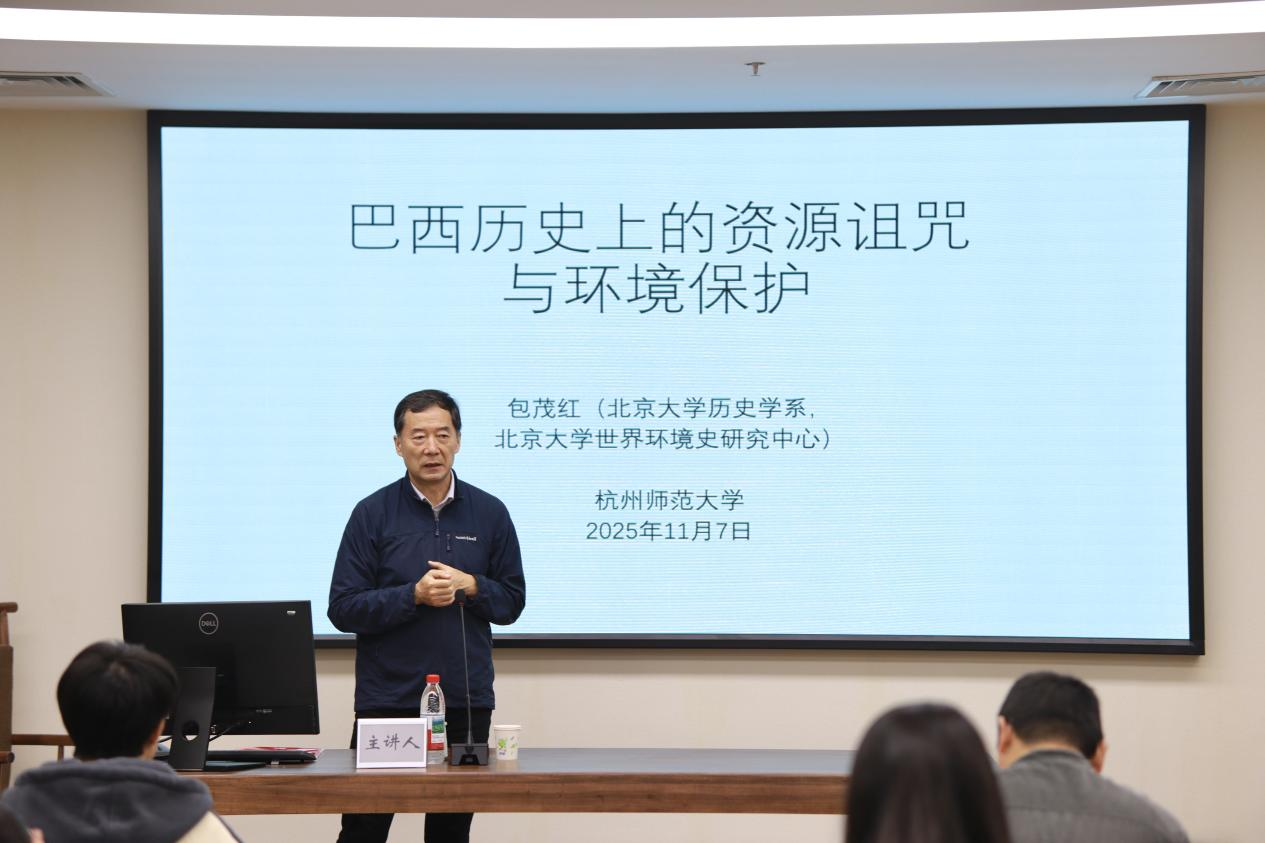 2025年11月7日上午,av视频 太炎讲堂“互视、他视与内视:近现代中国与世界”系列讲座于恕园23号楼314会议室顺利开展。本次讲座有幸邀请到北京大学历史学系包茂红教授,作题为“巴西历史上的资源诅咒与环境保护”的学术讲座。讲座由周东华教授主持,周真真教授、刘宏焘老师等老师及研究生、本科生50余人参加。