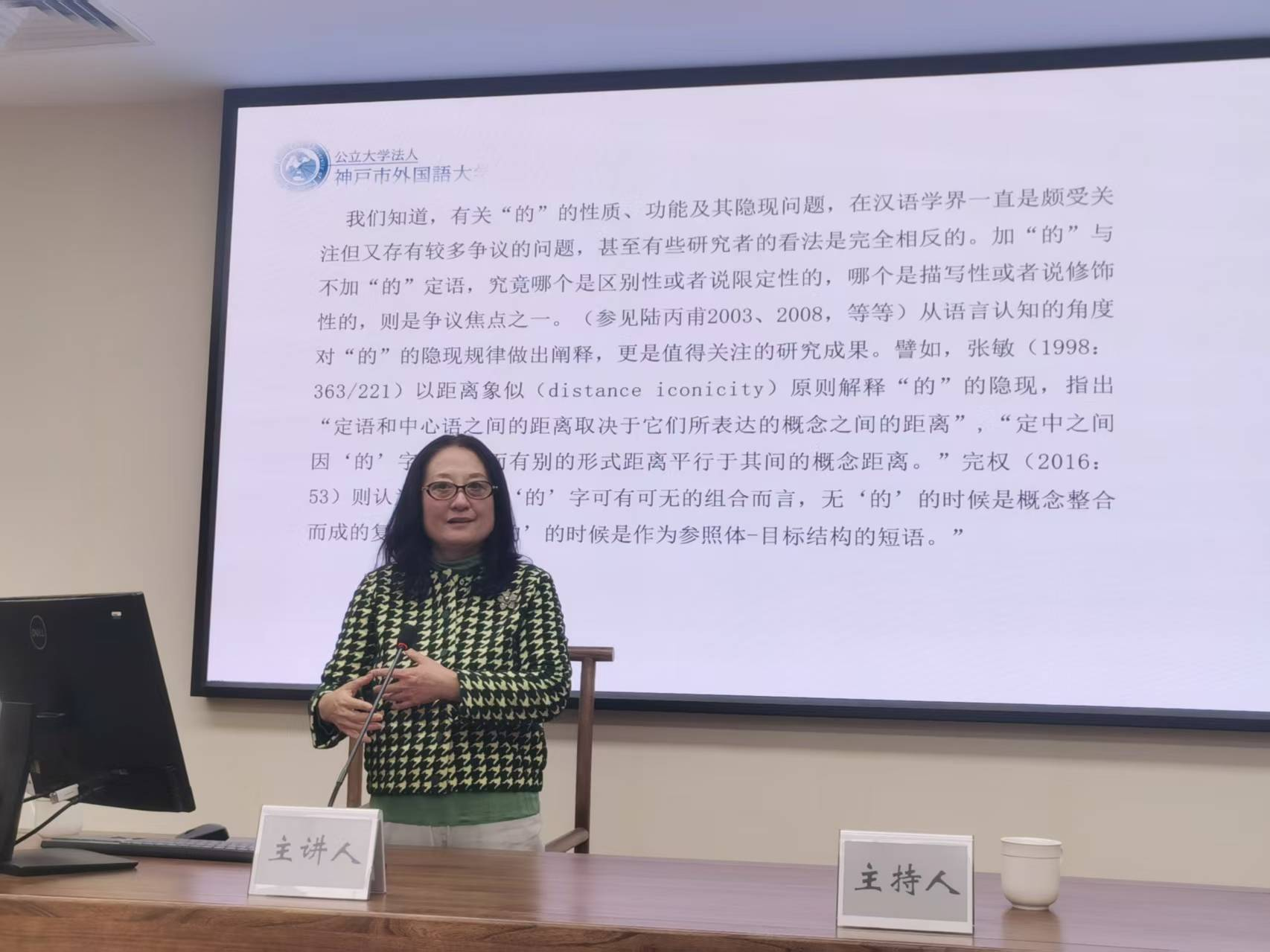 2025年11月27日晚,日本神户市外国语大学中文系教授、博士生导师任鹰教授应邀为av视频 师生作了题为《以“用”为本的“大语法”观念和汉语语法教学》的学术讲座。活动由单宝顺老师主持,约30余名师生参与。